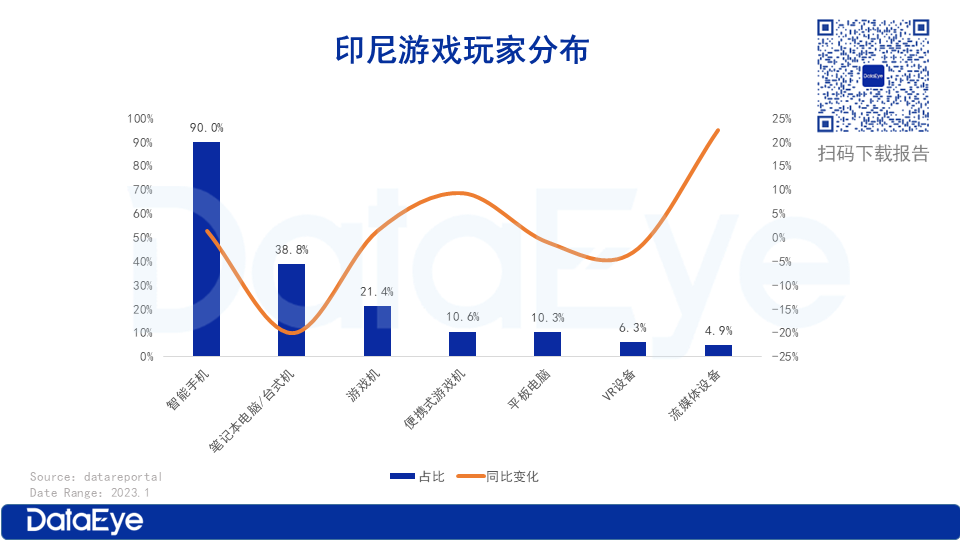 印尼94.8%的网民玩游戏,手游玩家规模约1.82亿人。在印尼总人口中,2.129亿人可以上网,约占77%。94.8%的印尼网民都在玩网络游戏,90%在手机上玩,该比例同比增加0.3%,即2023年印尼手游用户约1.82亿。