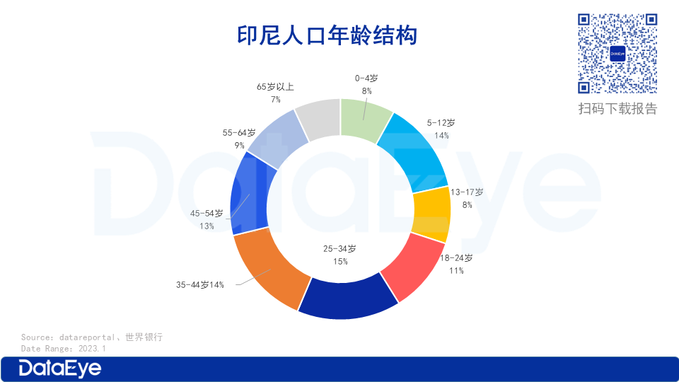 印尼平均年龄达29.8岁,人口年龄结构相对年轻。2022年,印尼65岁及以上人口占比为6.9%,尚未步入老龄化社会(世界老龄化标准为一个国家或地区65岁及以上人口数达到7%以上)。