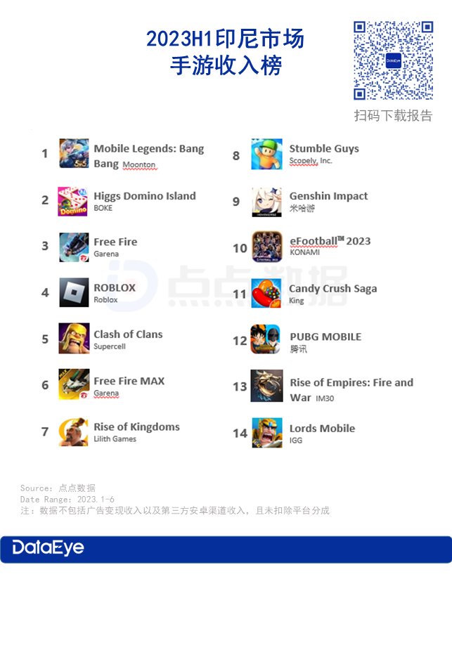 印尼手游市场:动作、策略、休闲类表现突出。2023年上半年,印尼收入TOP手游多为动作、策略以及休闲游戏,且多为在东南亚市场表现亮眼的大DAU产品。