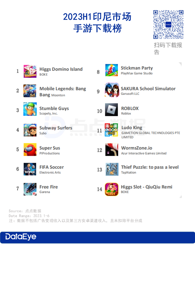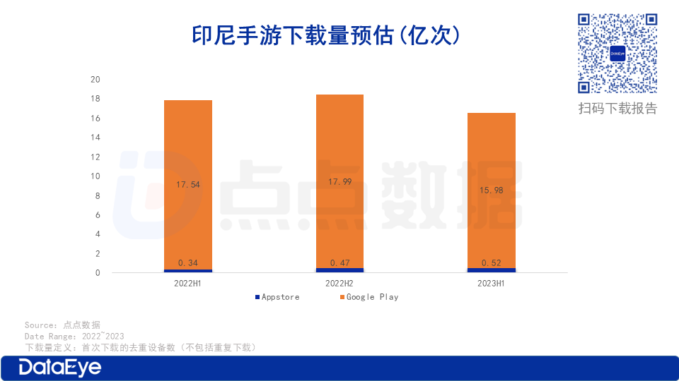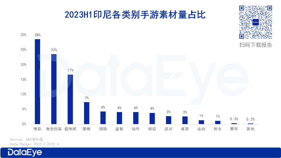 印尼市场下载:休闲、大DAU、博彩游戏位居前列。