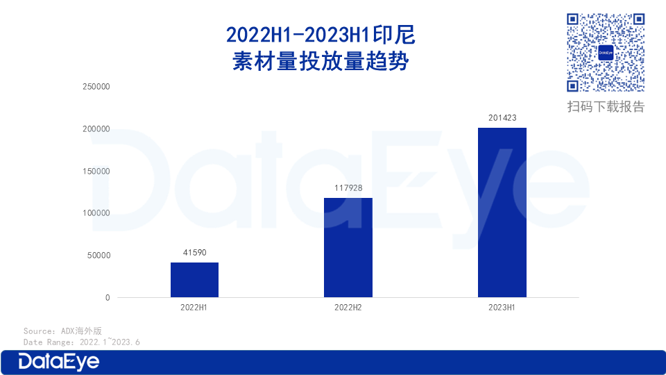 1. 2022H1、H2、2023H1印尼投放量趋势(去重素材量)