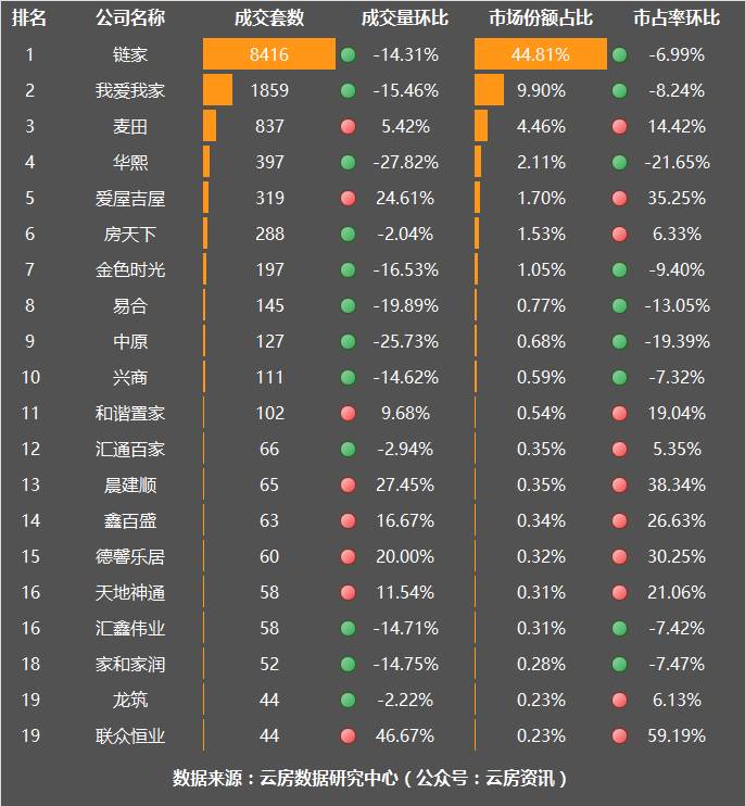 具体来看,链家成交8416套高居榜单首位,但成交量和市占率均出现下降,环比分别下降了14.31%和6.99%。