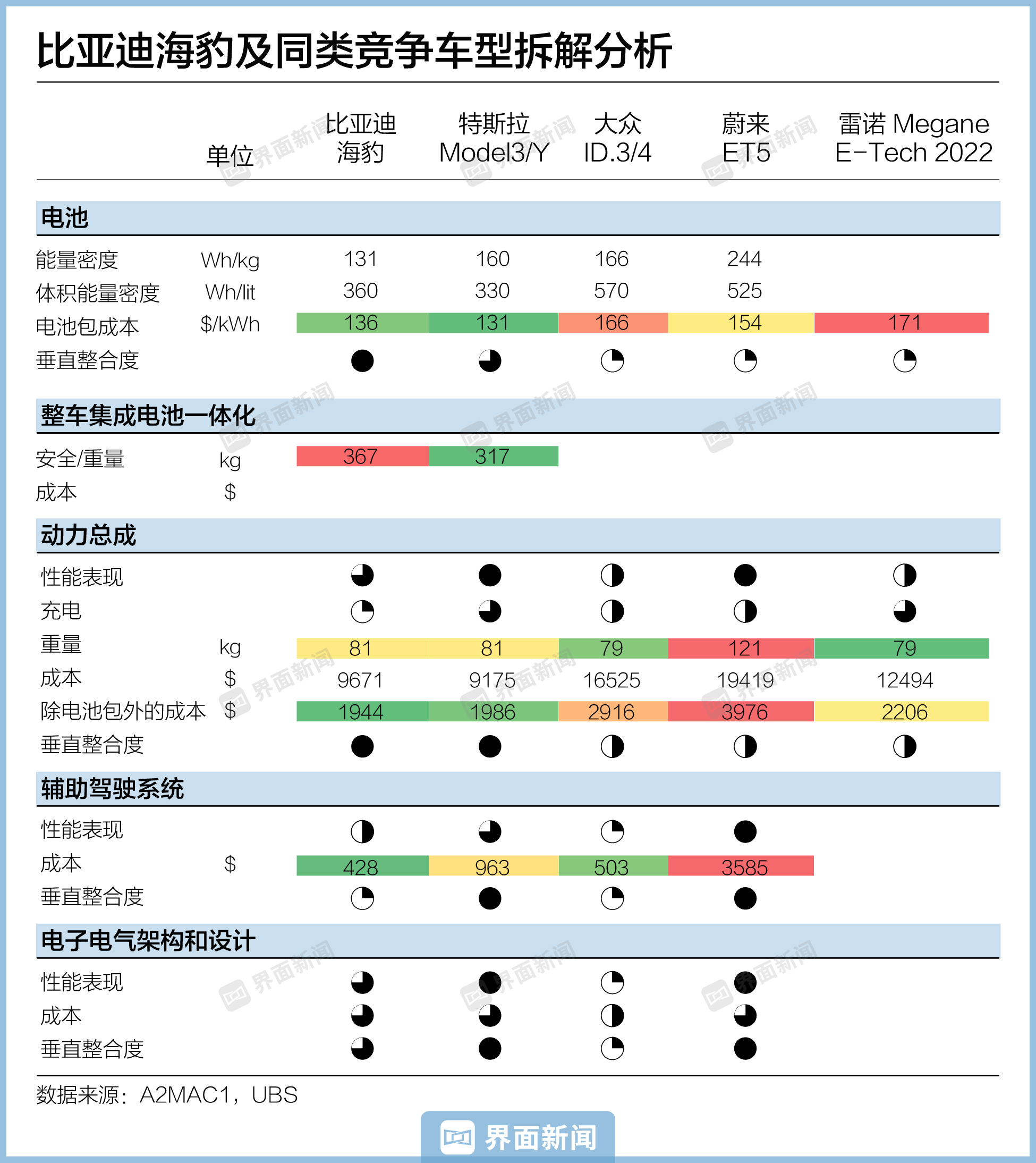 日前,瑞银证券研究部首次对中国电动车产品比亚迪海豹进行了拆解。研究报告发现,比亚迪海豹整体成本较同级别竞对车型,上海超级工厂生产的特斯拉Model 3低15%,比大众汽车在欧洲生产的相似规格车型成本低35%。