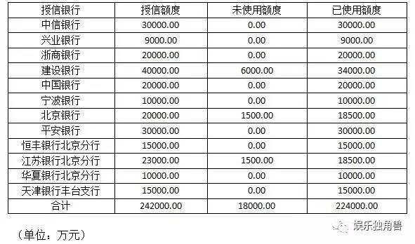 截至2016年6月30日,乐视网从国内各家银行获得的各类银行授信总额为 24.2亿元,其中已使用授信额度为 22.4亿元,未使用授信额度为 1.8亿元。