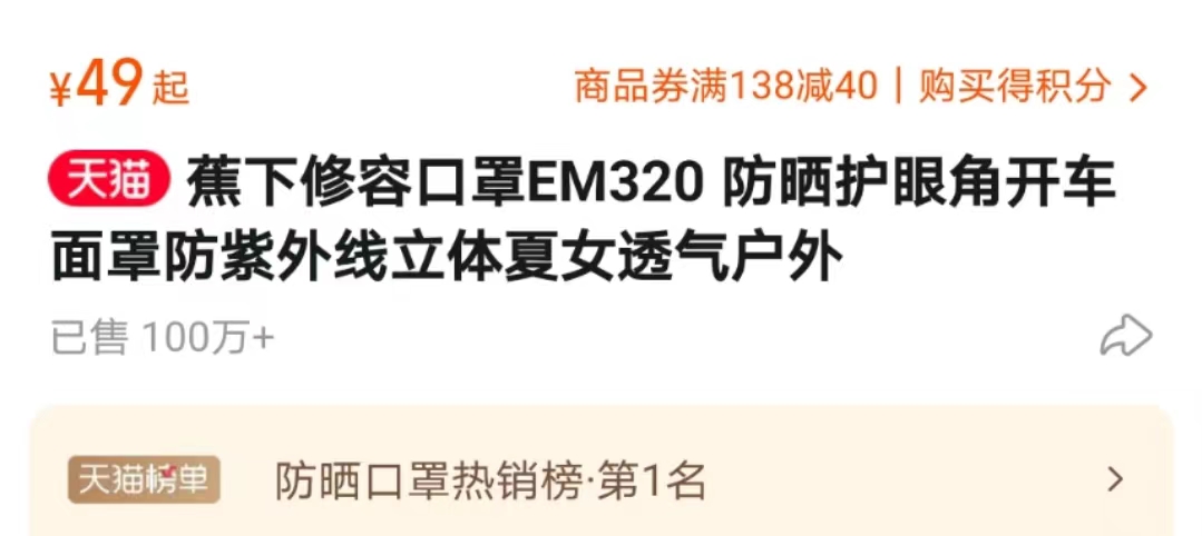 在蕉下天猫官方旗舰店中,防晒衣中销量最高的是定价169元的披肩款,销量超50万。定价49元的防晒修容口罩销量甚至已超百万。