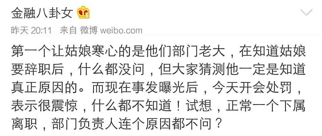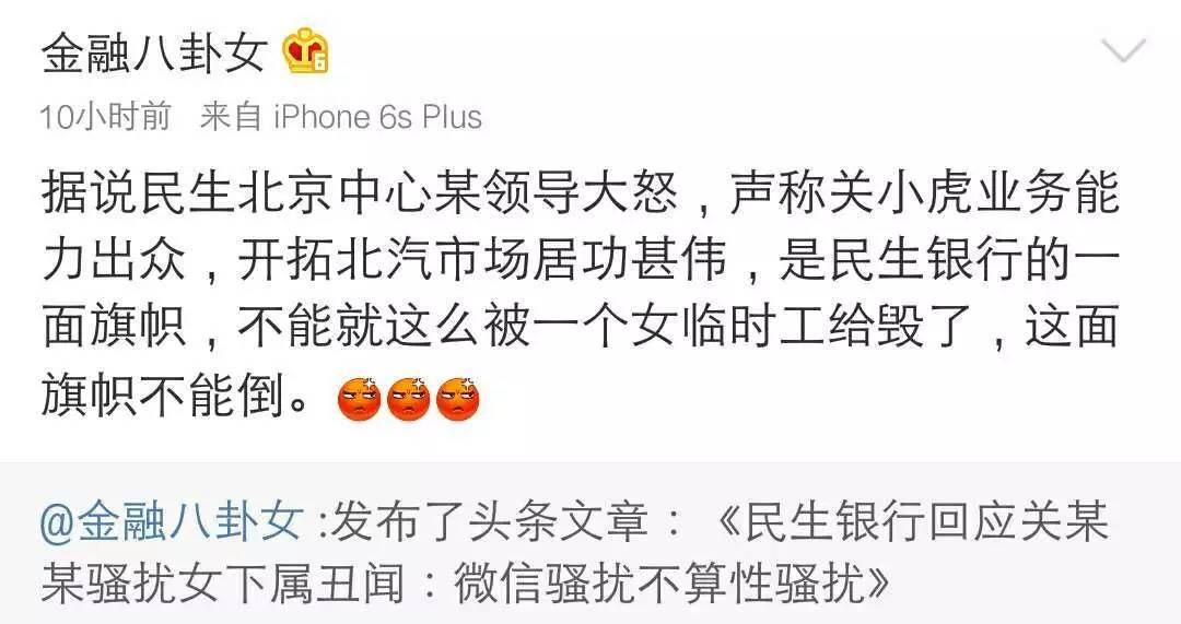 更有知情人士爆料,事情发生之后民生银行内部完全不思悔改,高层直指爆料妹子影响到了关小虎的前途。