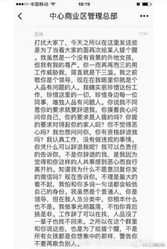 走投无路的情况之下,妹子将关小虎性骚扰自己的聊天记录发到了公司内部微信群里,希望能够警醒其他还在职的女员工。