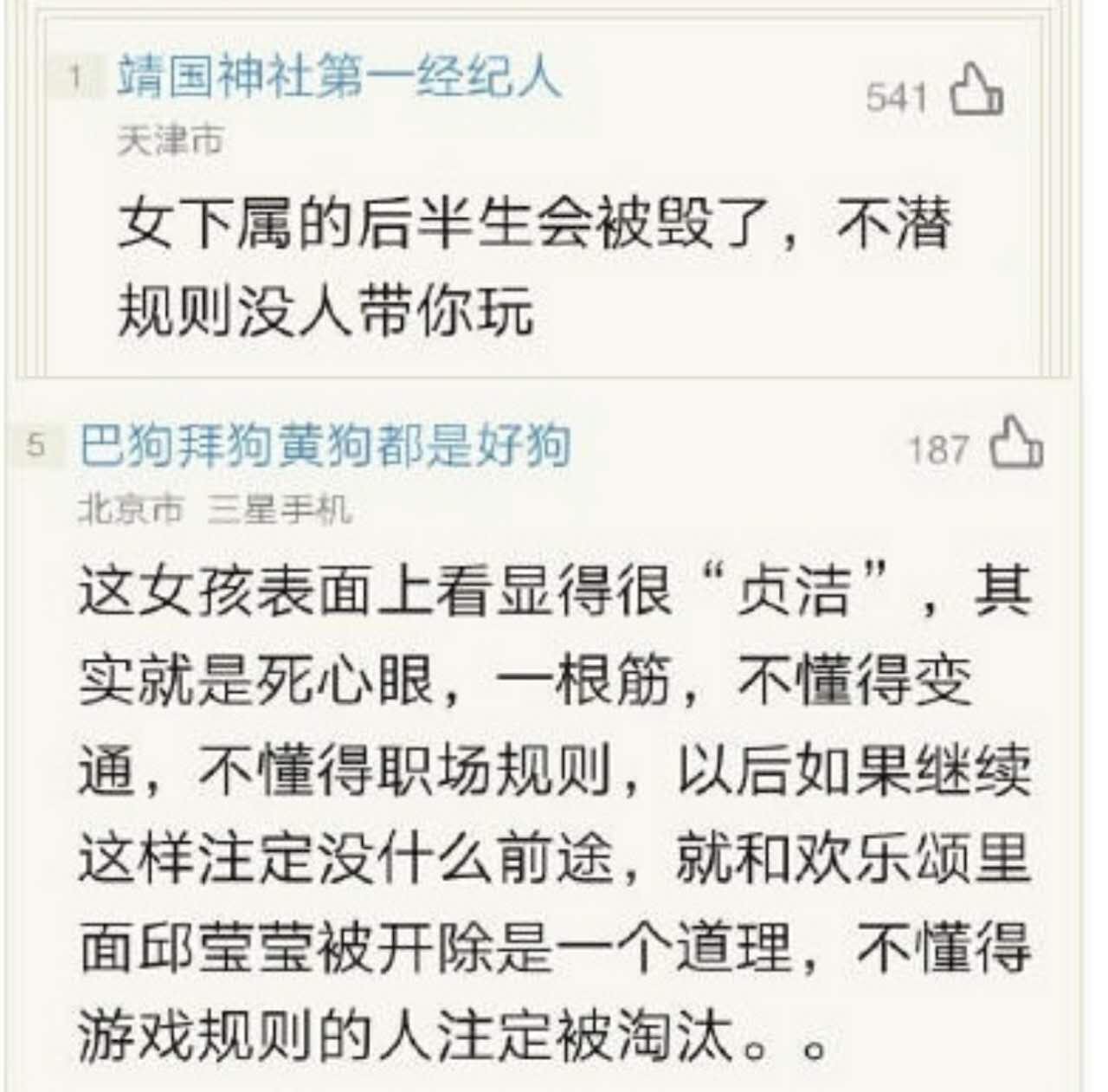 认为妹子不懂得“职场游戏规则”,在这件事情上没有掌握切实的证据,“正确”的做法应该是放低姿态,虚与委蛇,暂时迎合上司的安排,以期后续。