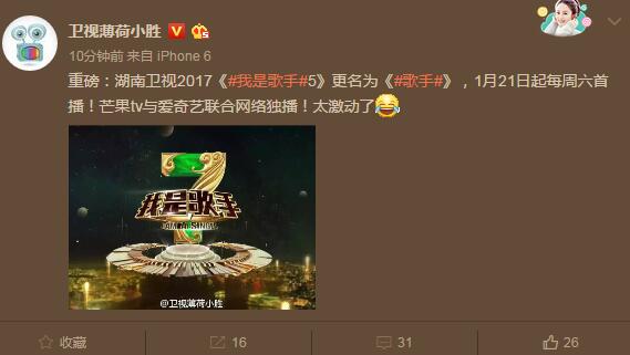 12月5日,微博认证为资深电视评论人,综艺视频博主的网友“卫视薄荷小胜” 爆料湖南卫视2017《我是歌手5》更名为《Singer》。“卫视薄荷小胜”表示:“重磅:湖南卫视2017《我是歌手5》更名为《Singer》,1月21日起每周六首播!芒果tv与爱奇艺联合网络独播”。