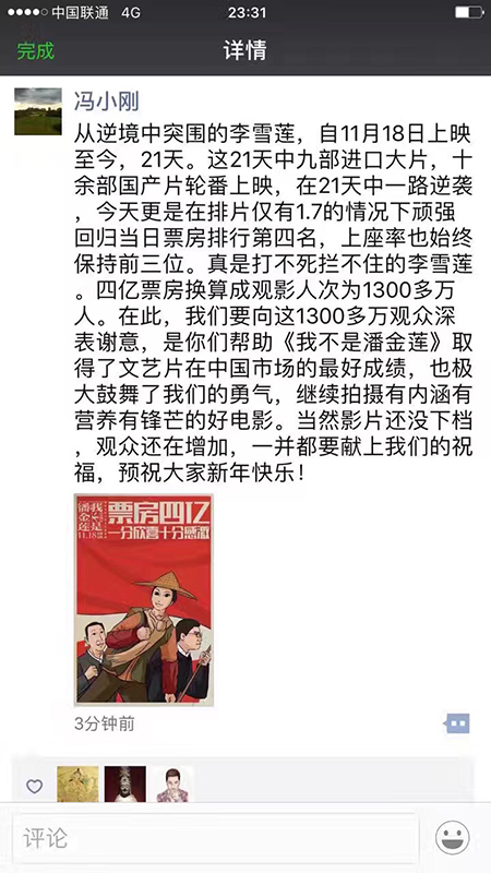 有评论认为冯小刚这么着急与其公司东阳美拉由华谊兄弟收购承诺的业绩收入有关。事后,母公司华谊兄弟董事长秘书高辉对外解释称,两年来东阳美拉的净利润已达到8000多万元,这还不含导演的电影片酬及代言收入,已完成业绩对赌。