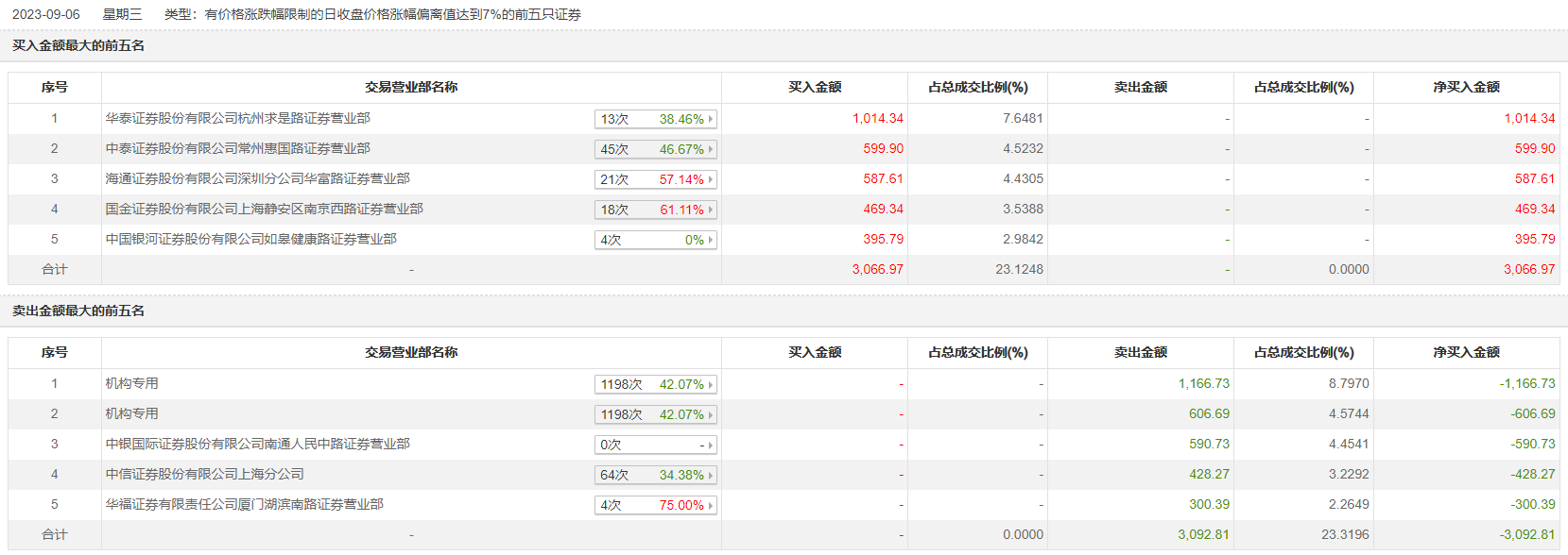 9月6日,菲林格尔今日涨停,龙虎榜数据显示,上榜营业部席位全天成交6159.79万元,占当日总成交金额比例为46.44%。其中,买入金额为3066.97万元,卖出金额为3092.81万元,合计净卖出25.84万元。