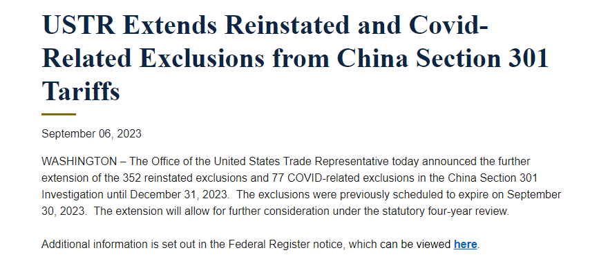 美国贸易代表办公室9月6日宣布,进一步延长对352项已恢复豁免的中国进口商品和77种与新冠防疫相关的中国进口商品的301条款关税豁免期,期限由今年9月30日延至12月31日。