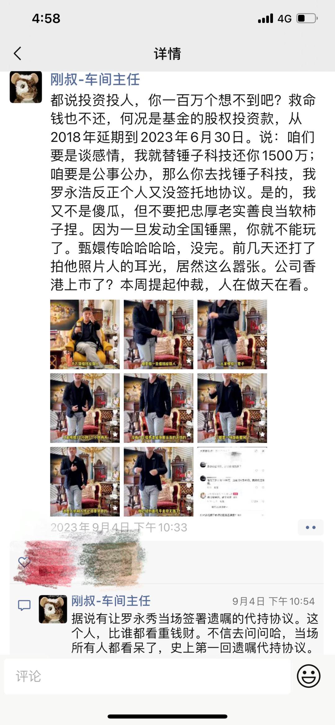“救命钱也不还,何况是基金的股权投资款,从2018年延期到2023年6月30日。说:咱们要是谈感情,我就替锤子科技还你1500万;咱要是公事公办,那么你去找锤子科技,我罗永浩反正个人又没签托底协议。是的,我又不是傻瓜,但不要把忠厚老实善良当软柿子捏。甄嬛传哈哈哈哈,没完。”近日郑刚在朋友圈再次将矛头对准罗永浩,语气强硬,并表示“本周提起仲裁,人在做天在看”。