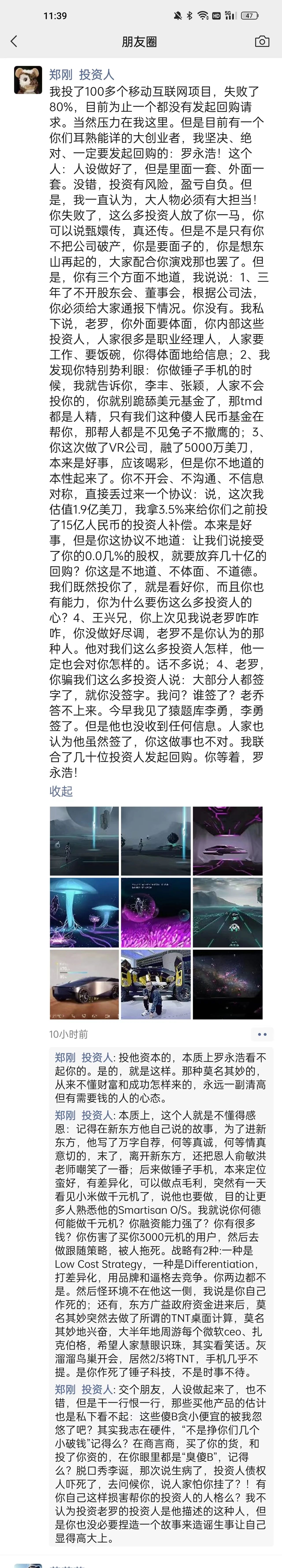 他同时强调,新的协议是对上一个项目失败后的补偿,不是通行的法理和逻辑。至于锤子科技,投资不是借款,投资的企业失败了就是失败了。