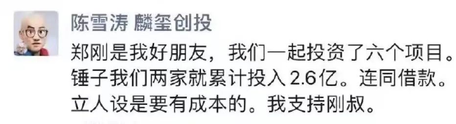 实际上,麒玺创投创始合伙人陈雪涛已经在朋友圈声援郑刚,表示“锤子科技我们两家就累计投入2.6亿”……“立人设是要有成本的”。