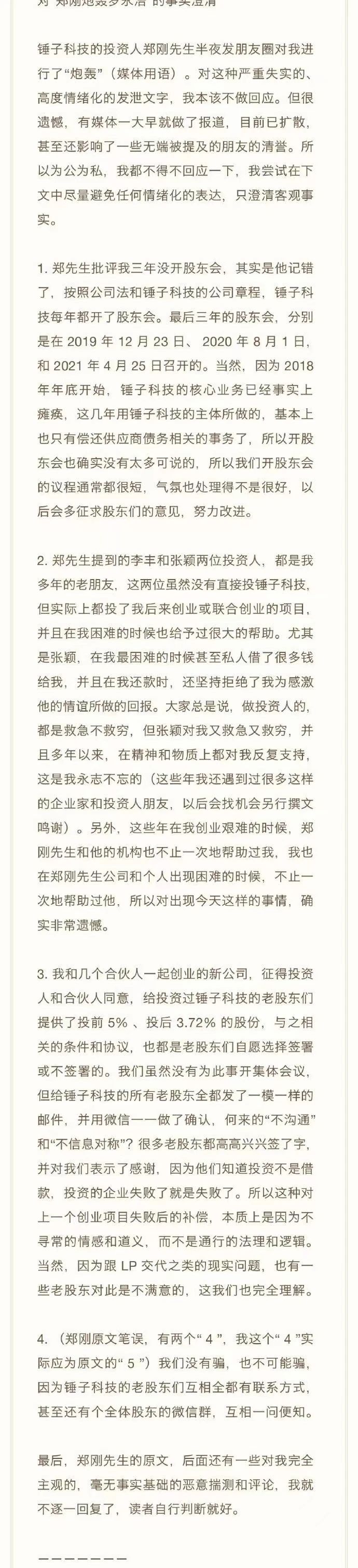 罗永浩称“投资不是借款”,郑刚继续“回怼”