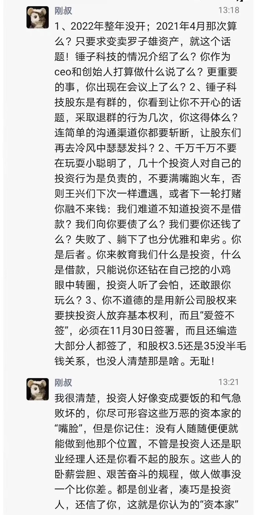 对于伴随新公司融资的新协议事件,郑刚进行了补充解释,自己关心的是“你(罗永浩)不道德的是用新公司股权来要挟投资人放弃基本权利,而且“爱签不签”,必须在11月30日前签署,同时编造了大部分人都签了”,而“和股权3.5还是35没半毛钱关系,也没人清楚那是啥”。