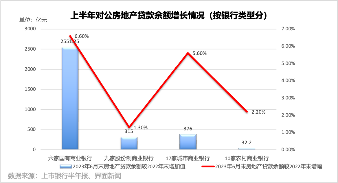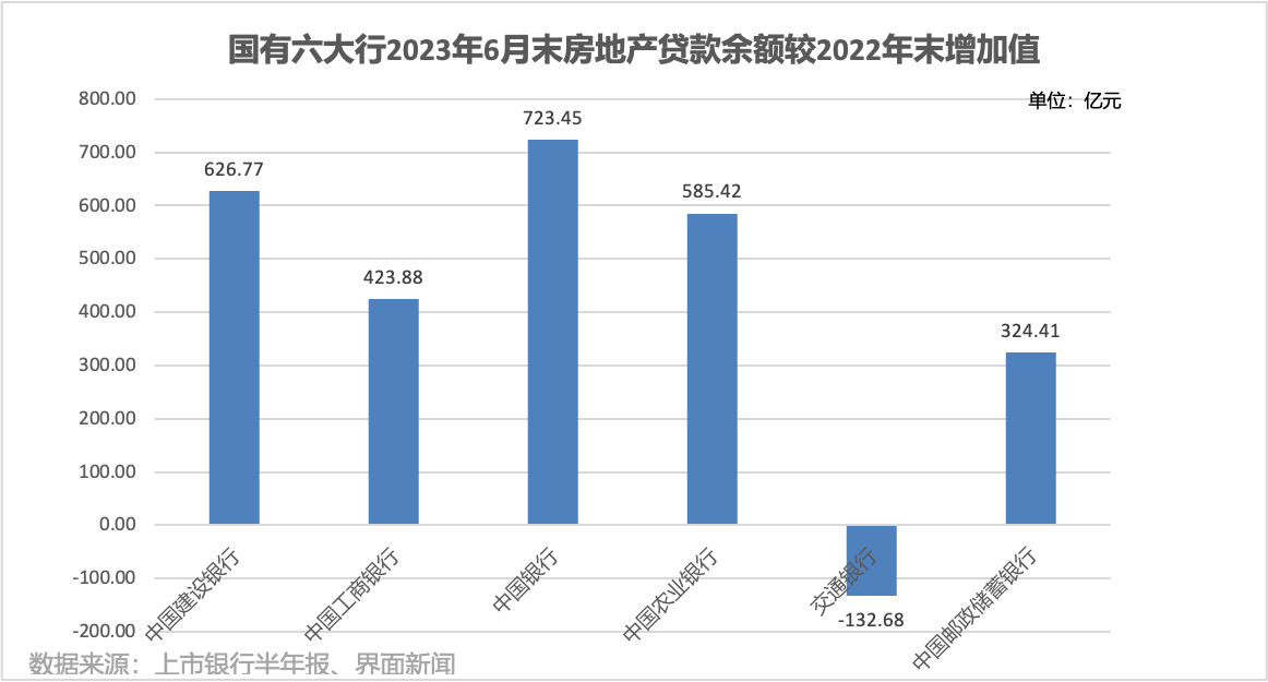 进一步拆分数据来看,6家国有商业银行中,除交通银行外,其余5家上半年对公房地产贷款余额均较上年末有所增长。