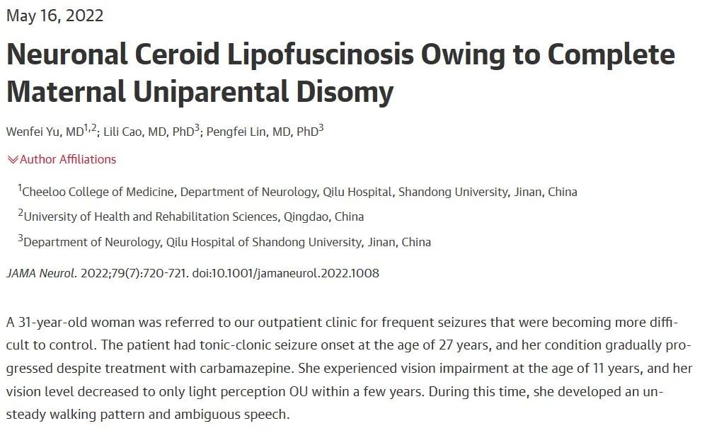 神经元蜡样质脂褐质沉积症是一种十分罕见的遗传性神经系统疾病,焉传祝教授团队在一个病因未明的神经元蜡样质脂褐质沉积症的家系中,发现单亲二倍体可能是少数病因未明的成年晚发神经遗传病的病因,本发现有助于一些罕见遗传病基因检测结果的解读。本论文以短篇报道的形式于2022年5月发表在JAMA Neurology(PMID: 35576013)。神经内科在读博士生余雯菲和曹丽丽主任医师为论文共同第一作者,神经内科林鹏飞副主任医师为论文通讯作者。