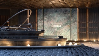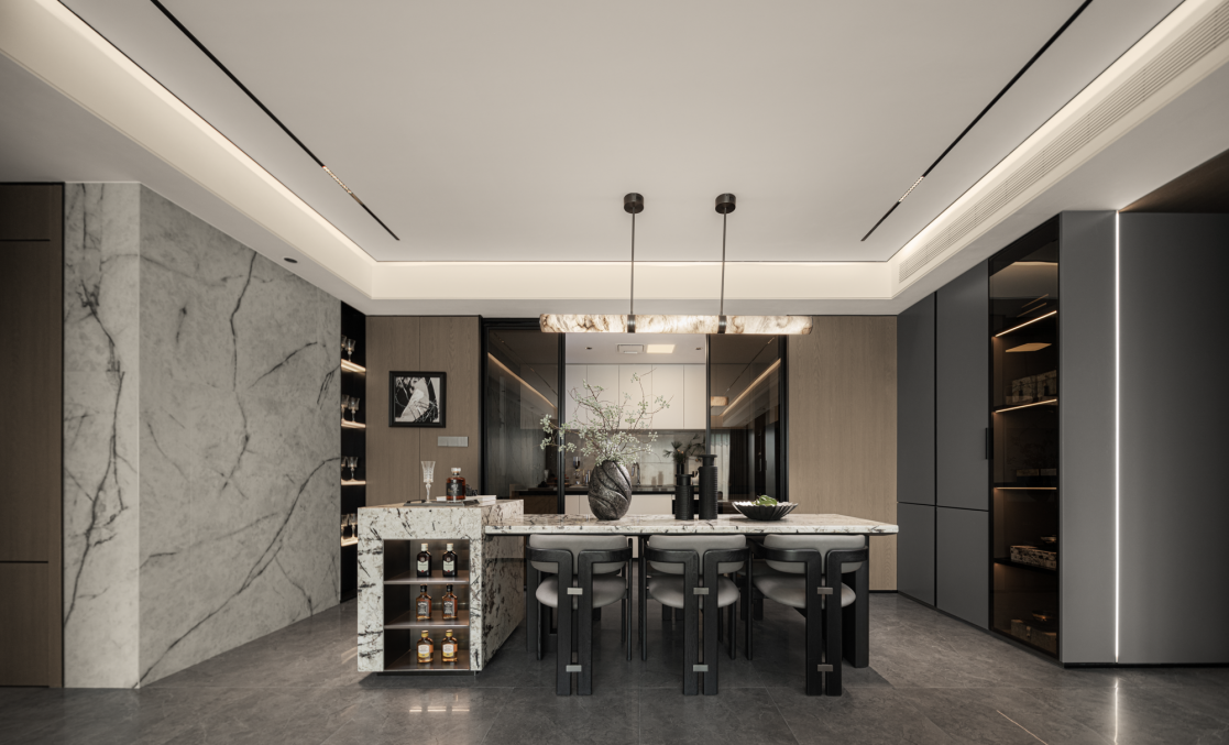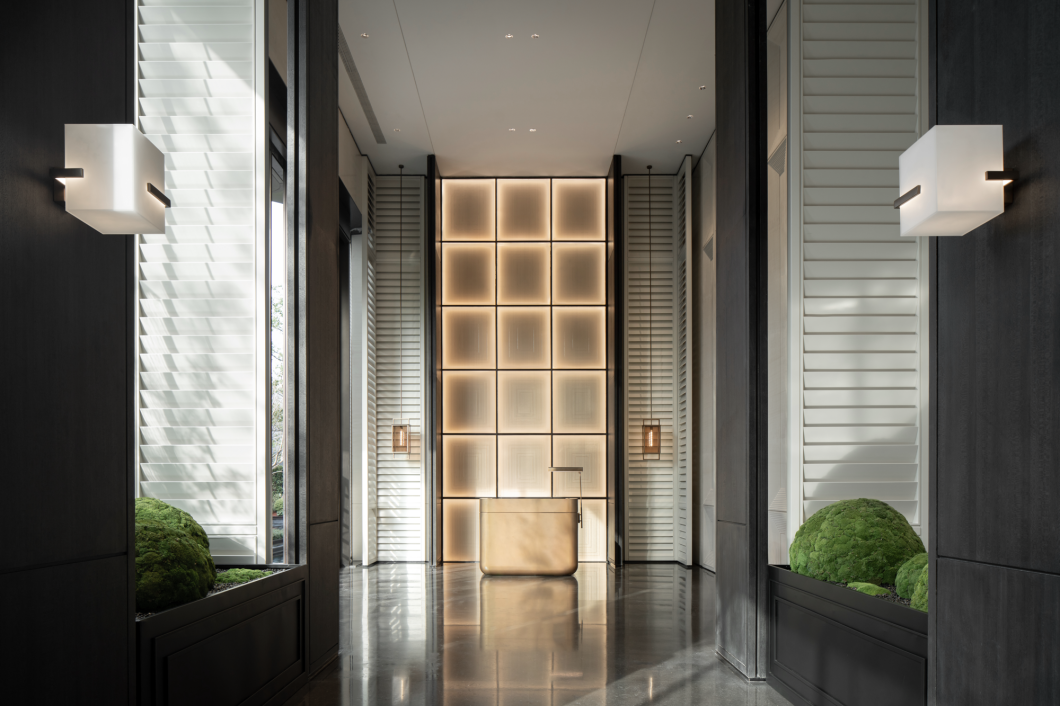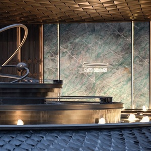 每位江山颂的初访者,都会为它恢弘无比的入口而惊叹:示范区入口是巴厘岛阿丽拉酒店同款石材雕刻的背景墙,有种高奢酒店独有的格调。此外提取自梵克雅宝《午夜天文馆》水景雕塑、纹路美丽的fantasy绿奢石景墙、璀璨星空顶、双曲香槟金不锈钢造型、精致泛光照明流水灯设计等,处处显露出高奢质感美学,带来沉浸式度假体验,低调而奢华。不仅配置、审美和工艺无可挑剔,江山颂还是全面对标全球高奢度假酒店,可谓气场全开。