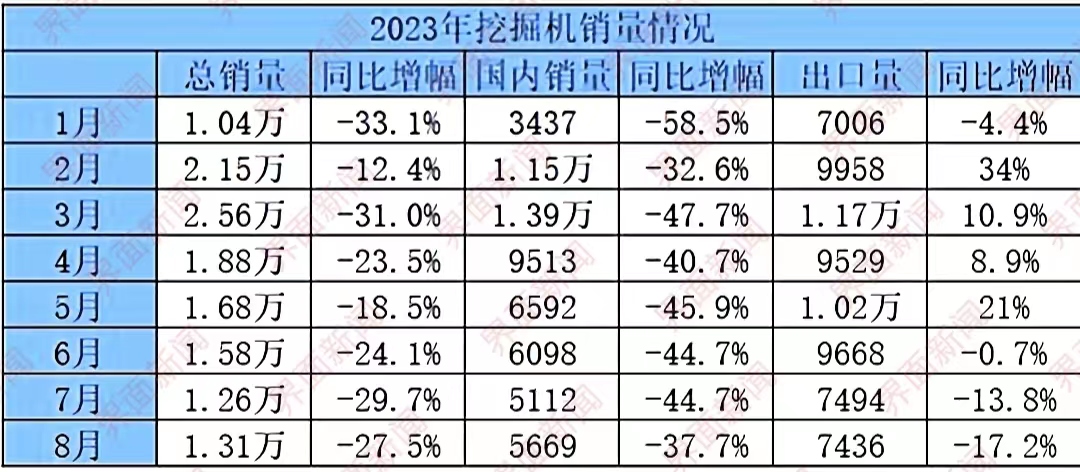 其中,国内销售5669台,同比下降37.7%;出口7436台,同比下降17.2%,为今年年内最大降幅。8月挖掘机内外销数据均略好于芝加哥商品交易所(CME) 的预期,此前其预期数据分别为5300台和7300台。
