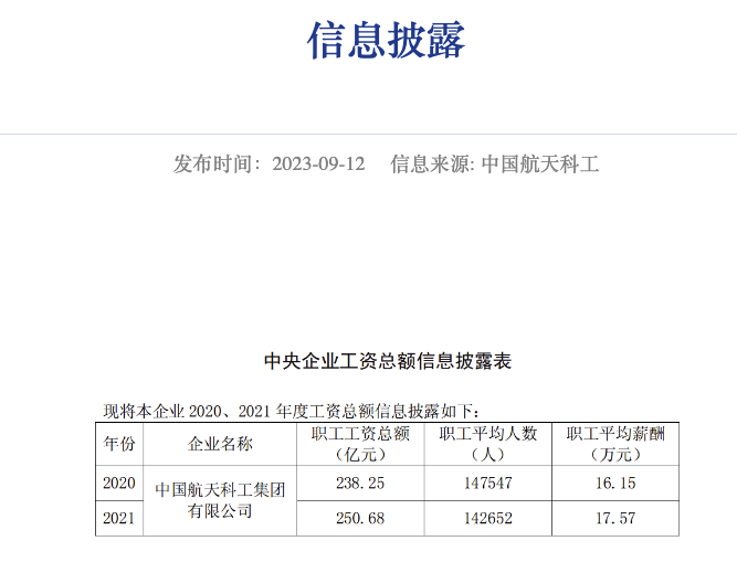 9月12日,中国航天科工集团有限公司在官网披露2020、2021年度职工工资总额信息。其中,2021年度职工平均人数为142652人,平均薪酬为17.57万元。