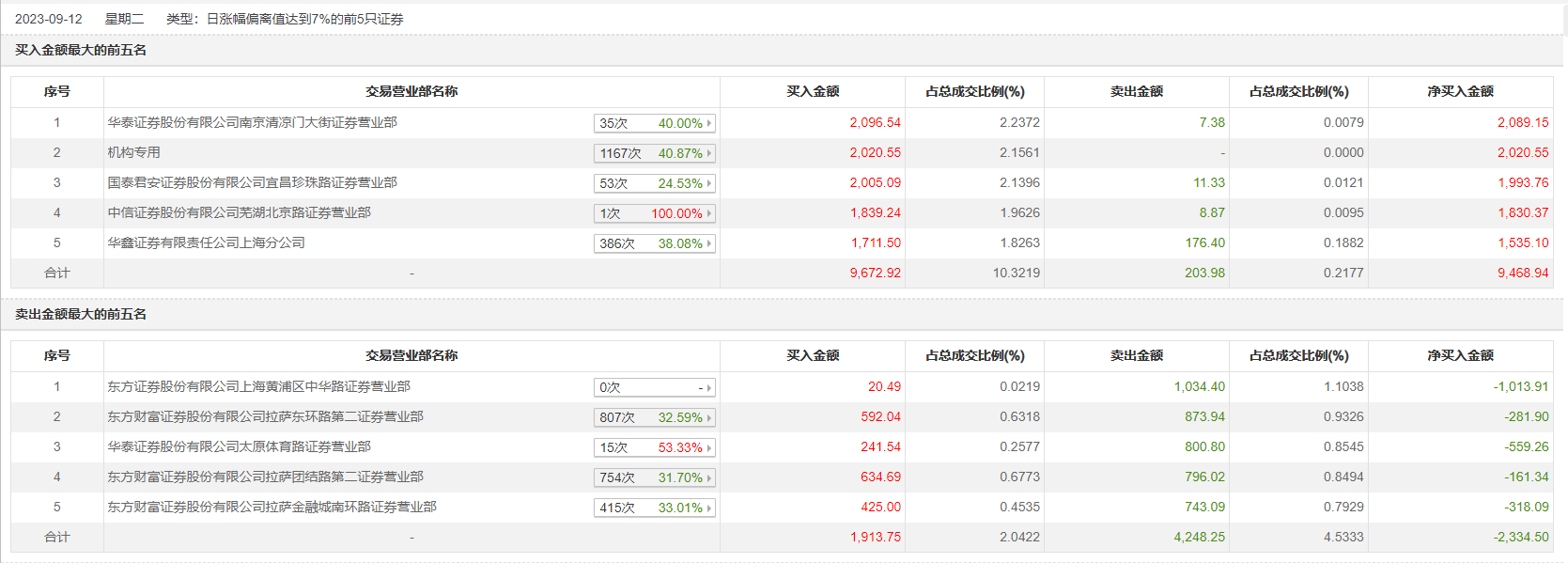 9月12日,兴民智通今日涨停,龙虎榜数据显示,上榜营业部席位全天成交1.6亿元,占当日总成交金额比例为17.12%。其中,买入金额为1.16亿元,卖出金额为4452.23万元,合计净买入7134.44万元。