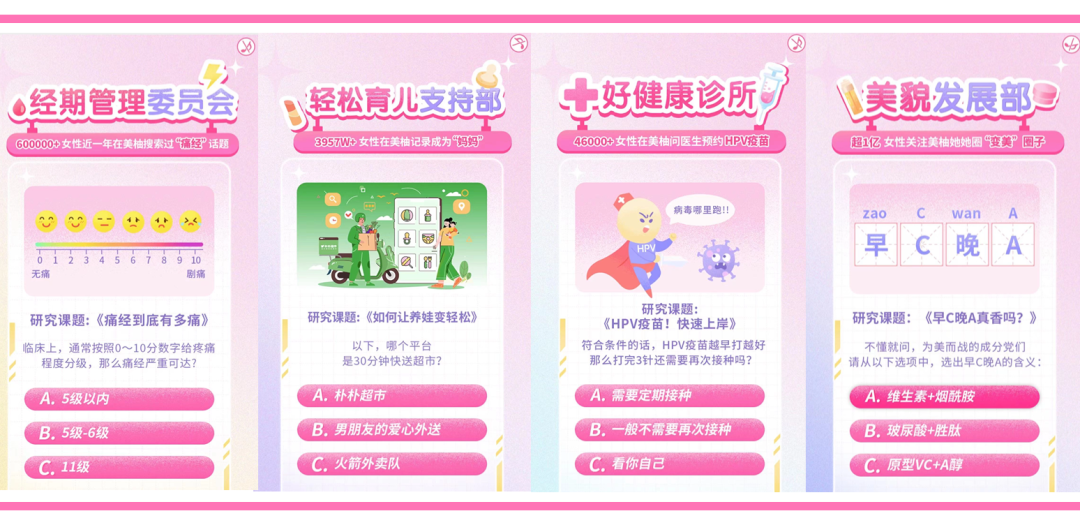 美柚App数据显示,截至2023年8月, 600000+女性近一年在美柚搜索过“痛经”话题;46000+ 女性在美柚问医生预约HPV疫苗;3957w+女性在美柚记录成为“妈妈”;超1亿女性关注美柚她她圈“变美”圈子。从这一连串的用户行为数据来看,“更美更健康”俨然成为女性关注的重点。