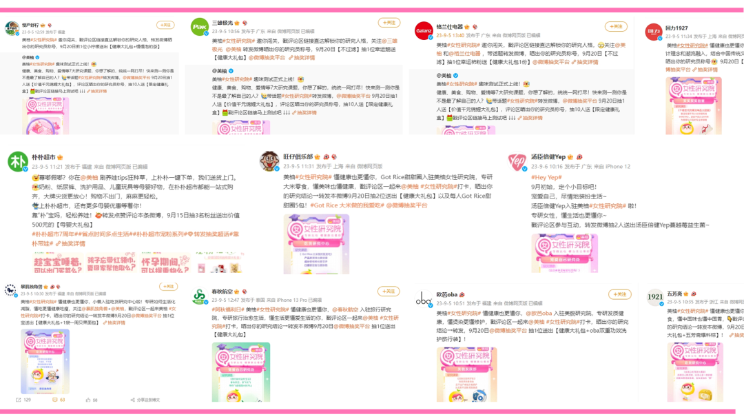 在站外,自带温度的女性健康话题,同样催生了用户极大的参与热情,活动上线当日,#女性研究院#微博话题阅读数破百万,近二十家蓝v品牌相继发布微博,透过品牌声量为活动助力。