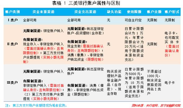 从三类账户的属性和区别来看,经过面对面确认用户身份的Ⅱ类户,除了特定交易有限额以外,和Ⅰ类户并无区别,可以满足居民几乎所有的用卡需求,且具有易注销、易管理和安全性更高等特征。相比之下,Ⅲ类户在功能属性上要鸡肋得多,通过对交易限额的再设置,Ⅱ类户在安全性上不输Ⅲ类户,而在功能属性上则要丰富得多。可以预计,未来一两年内,在互联网金融和日常小额转账支付领域,Ⅱ类户将逐步实现对Ⅰ类户的替代,成为市面上流通性最广的银行账户。