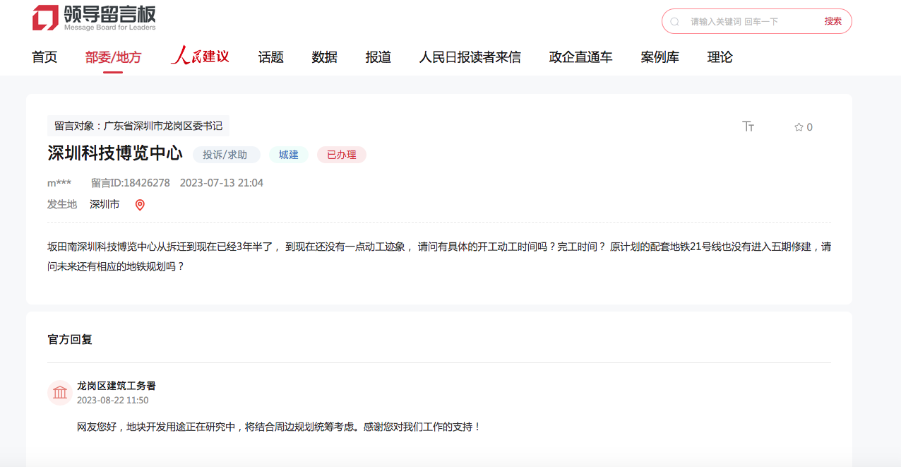 今年7月,有网友在人民网“领导留言板”上留言询问科博中心具体的动工、完工时间,龙岗区建筑工务署回复称“地块开发用途正在研究中,将结合周边规划统筹考虑”。