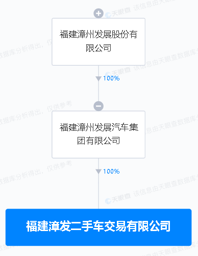 天眼查APP显示,近日,福建漳发二手车交易有限公司成立,注册资本1000万元,经营范围包含:电车销售;二手车经纪;机动车鉴定评估;汽车销售;二手车拍卖等。天眼查股权穿透显示,该公司由漳州发展间接全资控股。