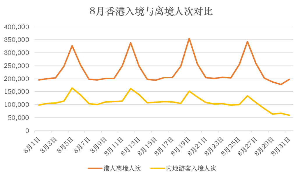事实上,港人并非不消费,只是换了地点。据界面大湾区统计,8月港人出境人次达716.12万人——几乎每个港人都外出了一次;同期访港旅客人次为407.78万人,离港人潮远超来港旅客人数,差额超300万人次。