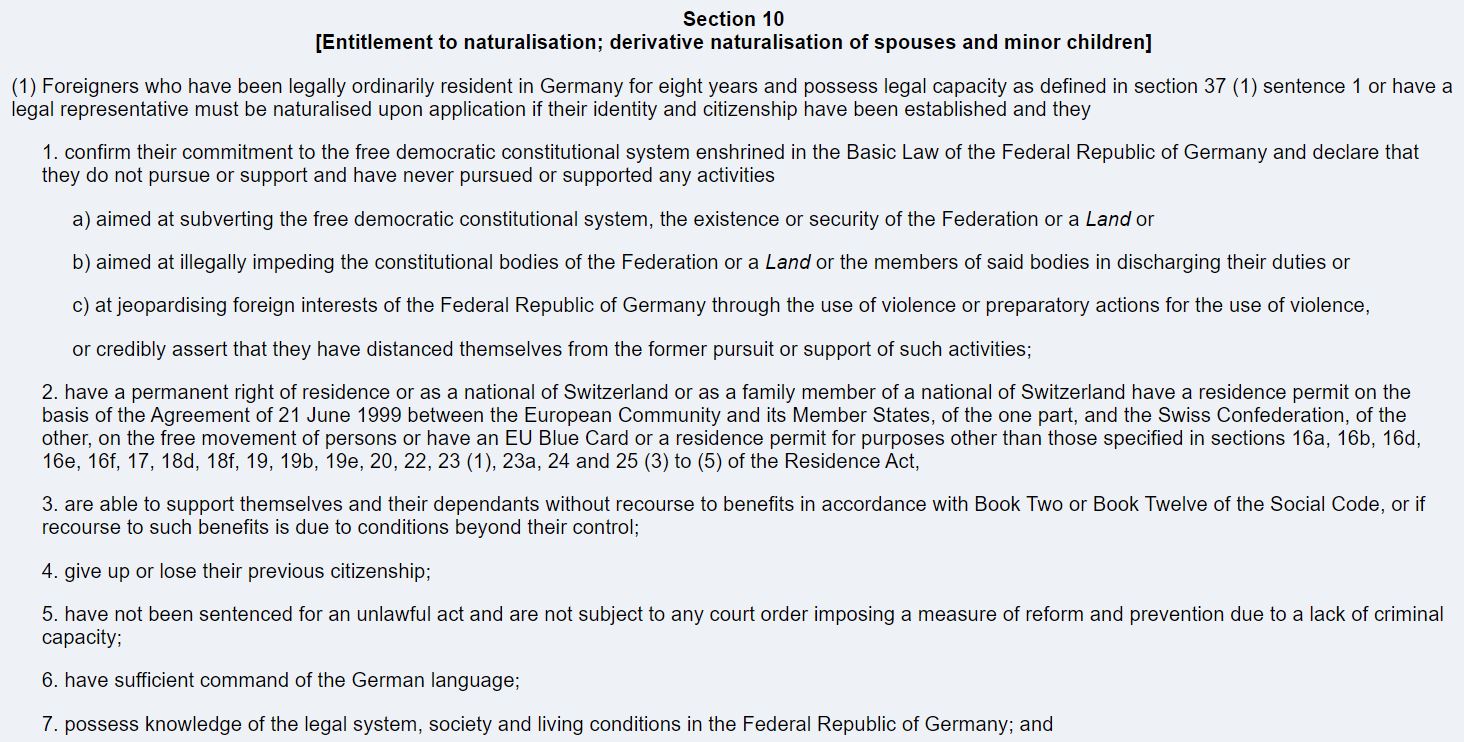 申请人必须遵守德国的自由民主宪法系统、能自食其力并保障受扶养者的生活、放弃或者丢失了原国籍、没有犯罪记录、能充分掌握德语、了解德国的法律系统和社会生活情况。申请人还需参加入籍考试并通过B1水平的德语测试。