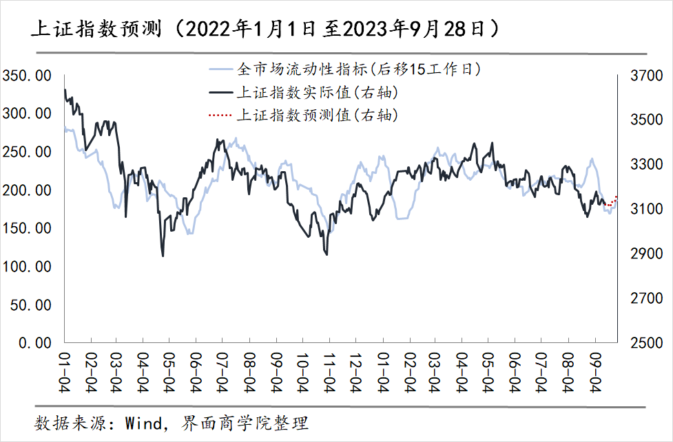 对于9月下半月(9月18日至9月28日)的走势,我们以重置后全市场流动性指数后移15个交易日作为上证指数变动预测的依据,可以看到后移的流动性指数与上证指数的吻合度相对较高。