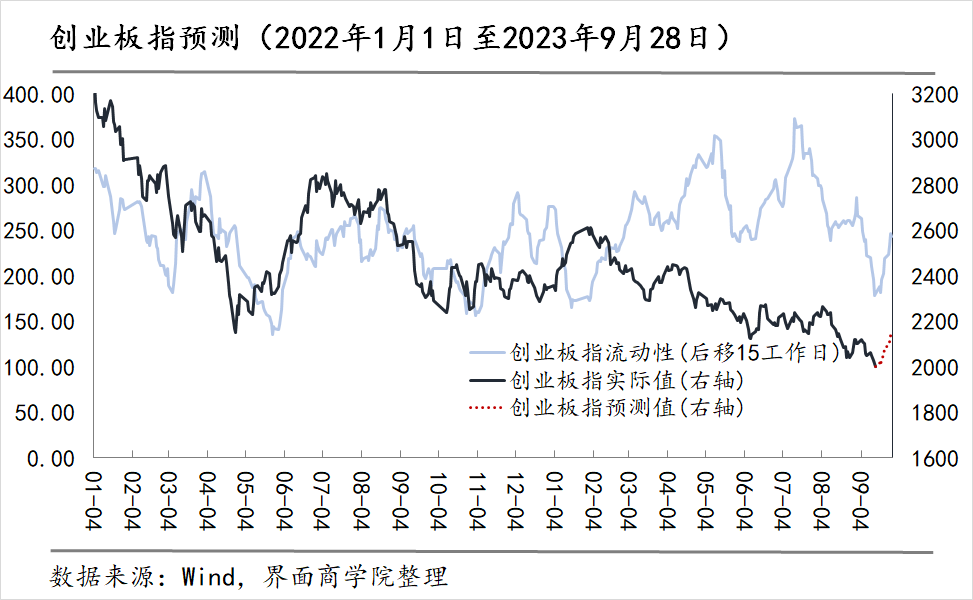 同时通过计算,我们将重置后创业板指流动性指数后移15个交易日作为创业板指变动预测的依据。