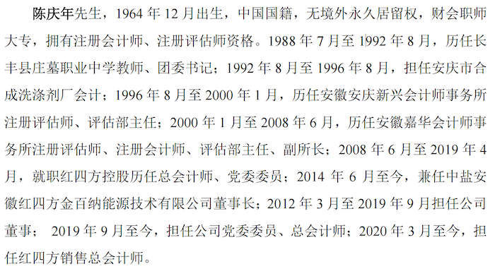 2014年6月起,陈庆年曾担任中盐安徽红四方金百纳能源技术有限公司(红四方控股控制的企业,以下简称“金百纳”)的董事长、法定代表人,自2014年7月起担任中盐红四方金百纳能源技术无锡有限公司(金百纳控股子公司,2017年5月4日注销,以下简称“金百纳无锡”)的董事长、法定代表人。