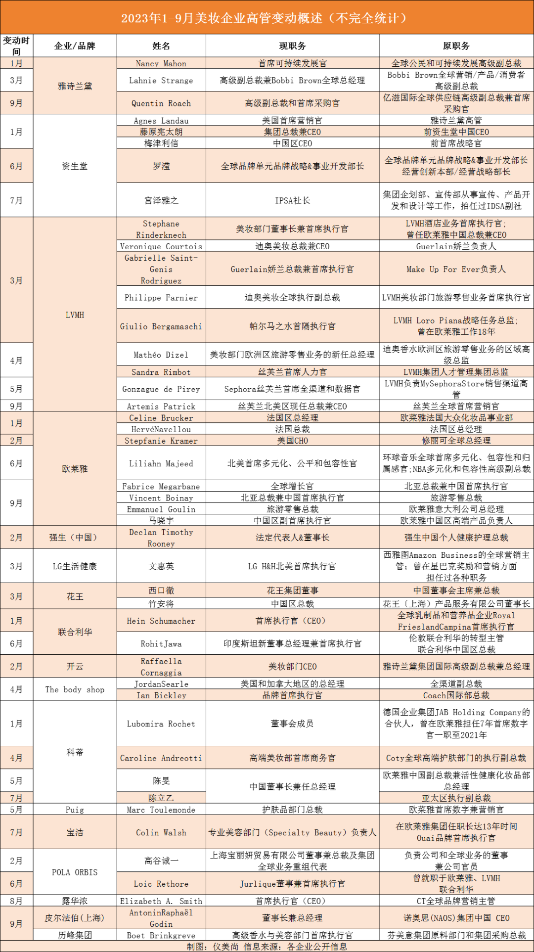 据仪美尚不完全统计,除欧莱雅外,今年1-9月,共有18家国际美妆企业,发生了45起高管“换帅”,企业包含雅诗兰黛、资生堂、宝洁等国际巨头,变动职位涉及董事长、首席执行官、地区总裁、品牌全球总裁等重要职位。