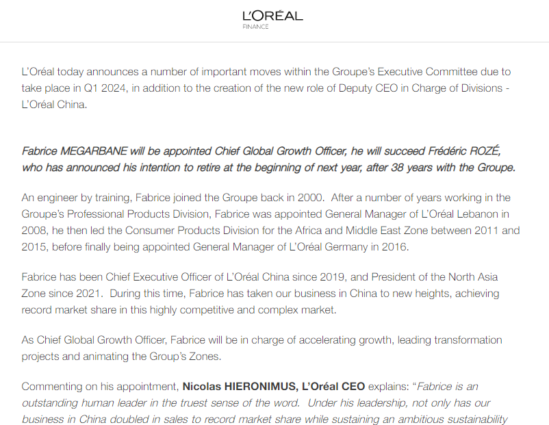 9月14日,欧莱雅集团公布了一系列新的人事任命。