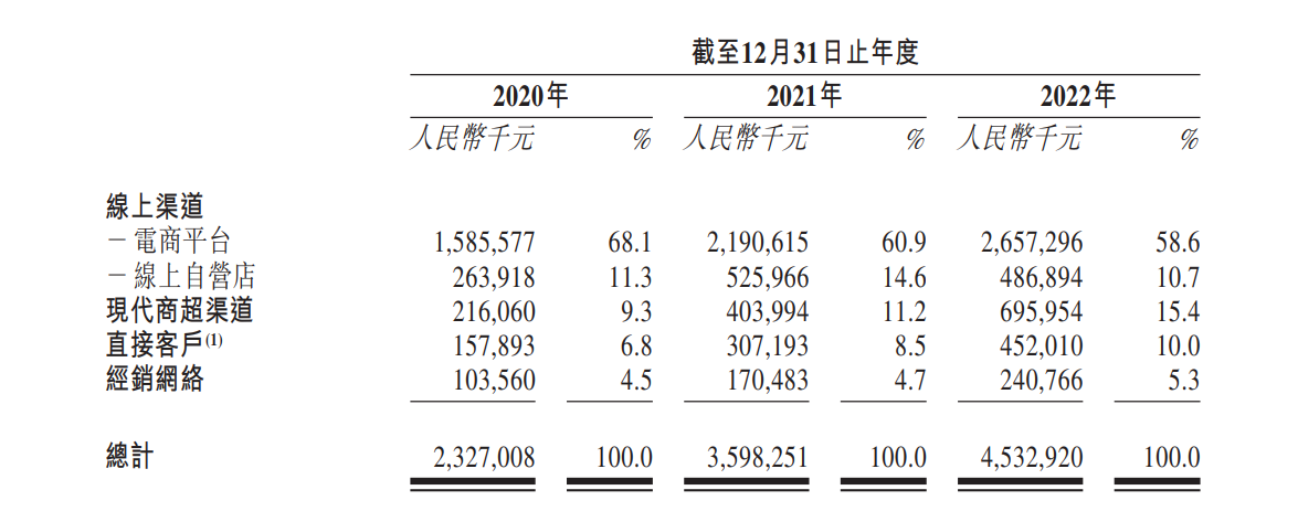 此前三年,线上渠道是十月稻田的业务重点。在营收贡献方面,线上渠道营收分别为2020年的18.50亿元,2021年的27.17亿元,以及2022年的31.44亿元,分别占总收入的79.5%、75.5%及69.4%。