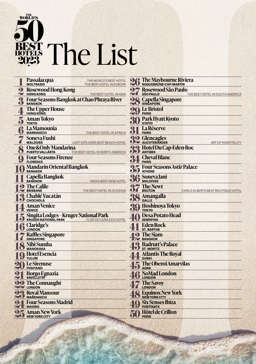 2023“世界50最佳酒店”榜单完整榜单如下: