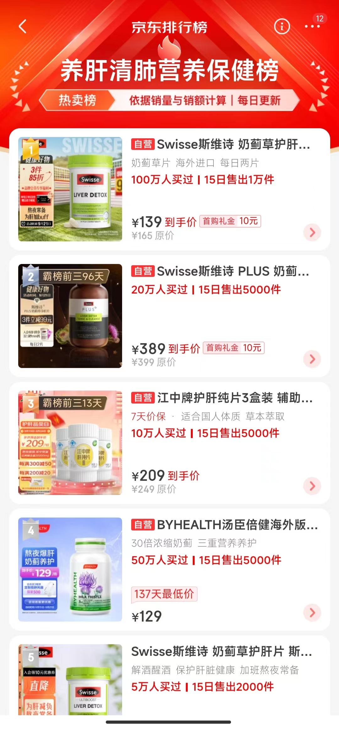 根据京东的养肝清肺营养保健排行榜,目前,澳大利亚保健品品牌斯维诗独占排行榜前二,超百万人曾购买,第三是江中牌护肝片,三盒售价209元,汤臣倍健则名列第四。