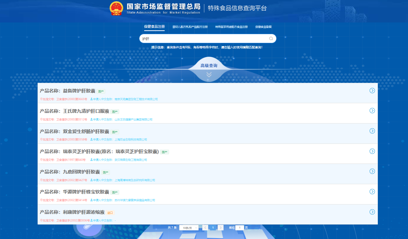 然而在国家市场监督管理总局特殊食品安全监督管理司的特殊食品备案里分别以“奶蓟草”和“护肝片”为关键词进行搜索,未检索到奶蓟草护肝片的相关备案信息。这些国外品牌的购物详情页面也没有显示蓝帽子标识。