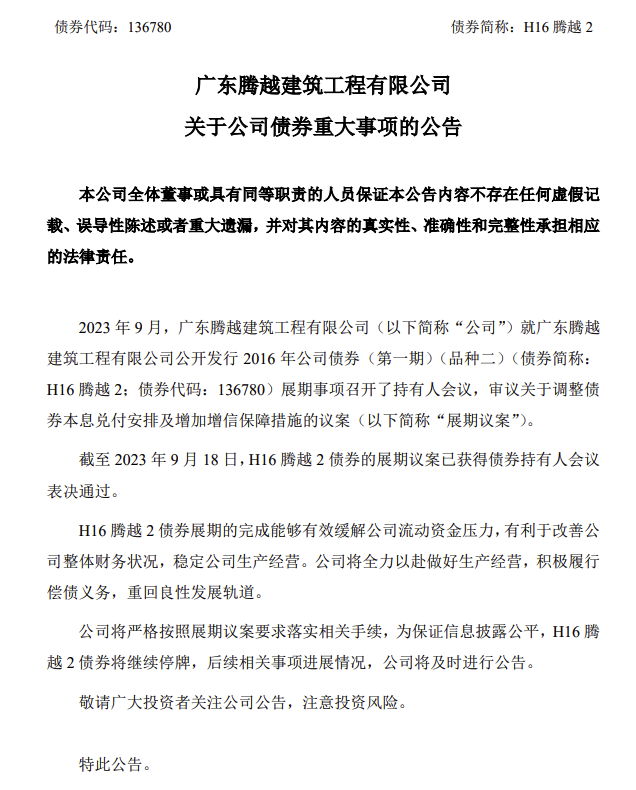 9月20日,碧桂园旗下广东腾越建筑工程有限公司发布公告称,截至2023年9月18日,“H16腾越2”债券的展期议案已获得债券持有人会议表决通过。公司将严格按照展期议案要求落实相关手续,为保证信息披露公平,“H16腾越2”债券将继续停牌,后续相关事项进展情况,公司将及时进行公告。