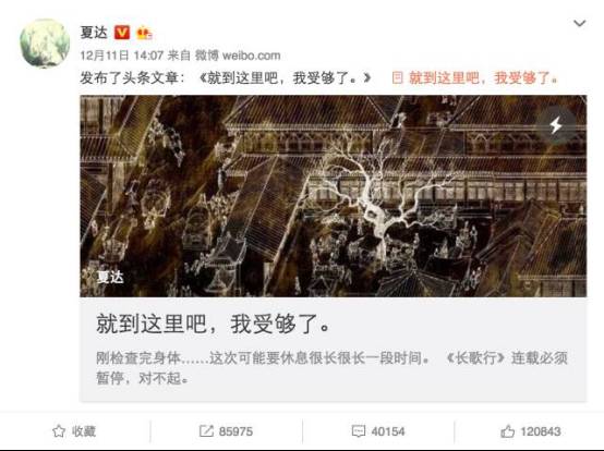 12月11日这天,美女漫画作家夏达突然在微博上发表长文《就到这里吧,我受够了》,细数了夏天岛创始人兼CEO姚非拉对她的种种不公平待遇。与此同时,她表示自己的身体不好,不能继续更新《长歌行》了。这条微博发布之后,短短几个小时,阅读量就过千万,不少粉丝和漫画作家公开表示支持夏达。
