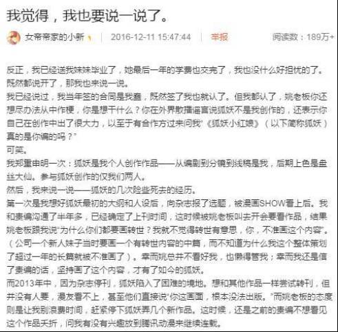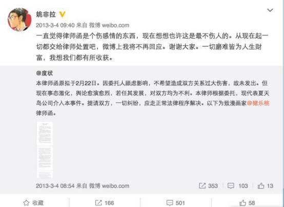 由此,漫画界的战争打响了,猪乐妖反击姚非拉,发表了关于两人长达11年地下情的微博长文,揭露了她在夏天岛遭到的不公平待遇和解约内幕。