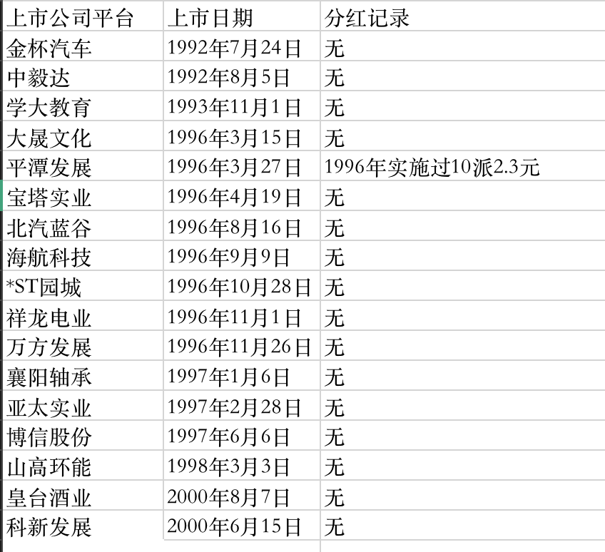 1993年至2002年这个时段上市的公司,未有分红记录的,有诸如学大教育(000526.SZ)、平潭发展(000592.SZ)、宝塔实业(000595.SZ)、万方发展(000638.SZ)、襄阳轴承(000678.SZ)、亚太实业(000691.SZ)、山高环能(000803.SZ)、皇台酒业(000995.SZ)等共计15家。