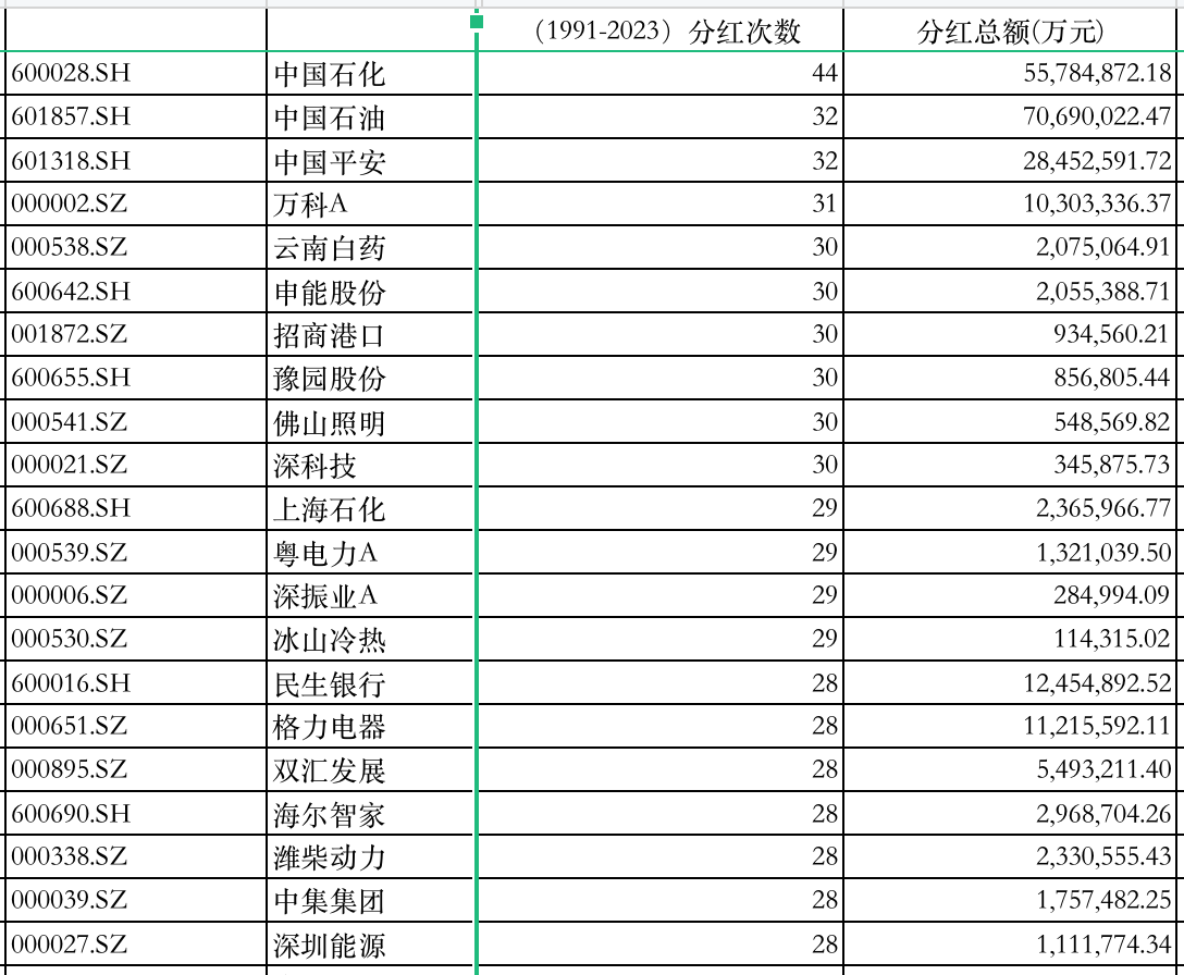 根据万得数据,将1991年至2022年的数据拉一个表,就会发现市场喜欢的“现金奶牛”也有不少,其中分红最多的高达44次,是中国石化(600028.SH)。