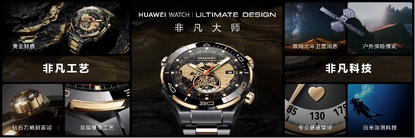 本次发布会上,全新超高端品牌ULTIMATE DESIGN 非凡大师正式宣布。同时发布了该品牌的首款智能腕表——HUAWEI WATCH ULTIMATE DESIGN 非凡大师。作为华为首款黄金智能表,该产品在材质工艺上首次融合18K珍贵黄金,黄金表圈、黄金旋转表冠、黄金PVD表圈刻度、黄金PVD钛金属表带都融入了这一工艺。表扣采用全新自研可伸缩蝴蝶扣,表带无需工具即可实现伸缩微调,用户佩戴体验更加贴合舒适,手表测得的运动健康数据也能更加准确。
