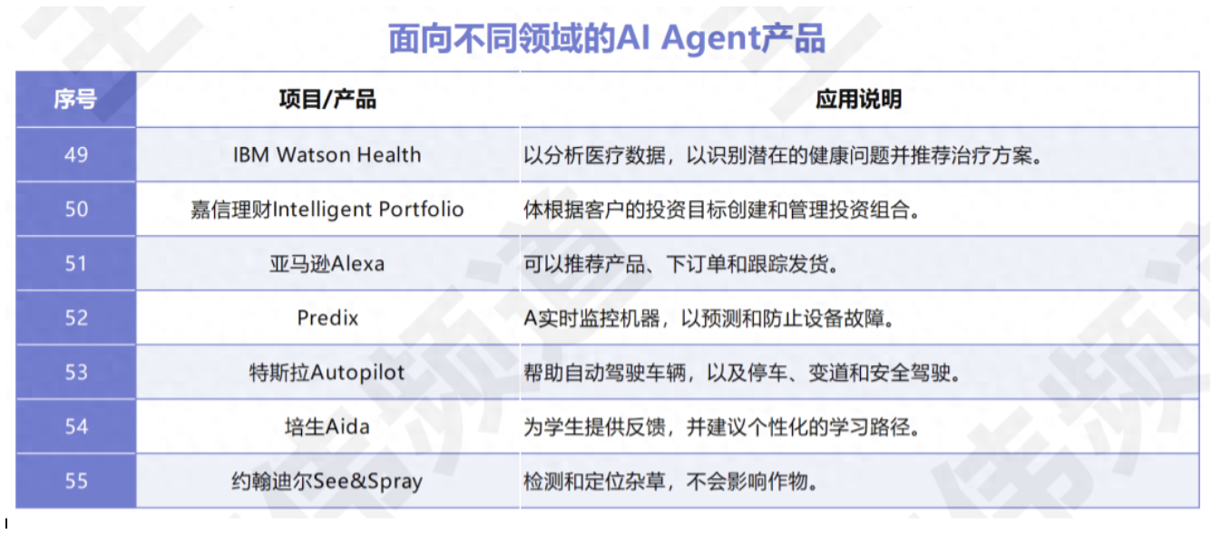- 在医疗领域,Agent可以帮助诊断、治疗和监测患者。IBM Watson Health 是一个AI智能体,可以分析医疗数据,以识别潜在的健康问题并推荐治疗方案。